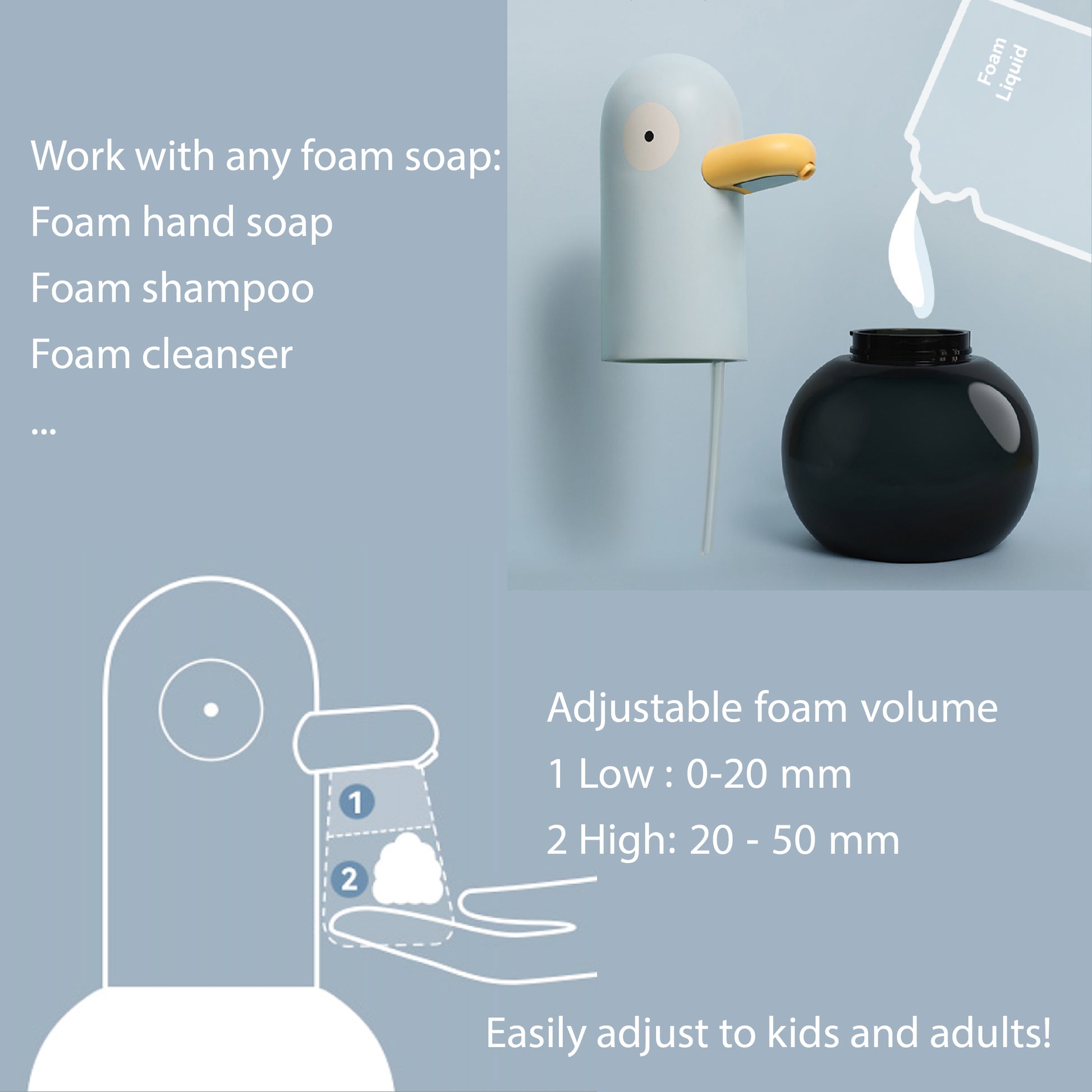 Upgrade your handwashing with the MYPIWI Touchless Foam Soap Dispenser, combining hygiene, style, and convenience. Its fast infrared sensor delivers foam in just 0.25 seconds, while the 400mL tank, one-touch operation, and auto-clean feature make it easy to use. The rechargeable 1800mAh USB-C battery lasts long and charges in just 3.5 hours. Compatible with various foam soaps, its charming duck-shaped design adds a stylish touch to any space. Durable and waterproof (IPX4), it's perfect for hassle-free use at home or in the office.